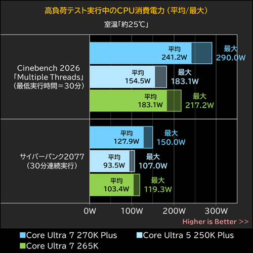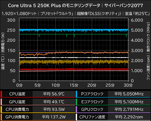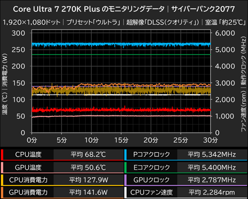 なお、高温かつ全コアフル稼働中のCore Ultra 7 270K Plusの発熱は大きなものだが、サイバーパンク2077実行中の平均CPU消費電力は平均127.9W(最大150.0W)ほどでしかなく、CPU温度も平均68.2℃(最大81℃)に抑えられている。