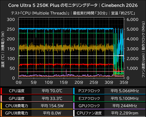 平均CPU温度が90℃を超えるCore Ultra 7 270K PlusのCPU消費電力は平均241.2W(最大290.0W)を記録しており、電力リミットの250Wをほぼ使い切るほど大きなものとなっているが、それでも冷却不足が生じていないので、空冷CPUクーラーであるCPS RT620 PRO BKで十分な冷却ができているといえる結果だ。実際、モニタリングデータの推移グラフでも安定した動作が確認できた。
