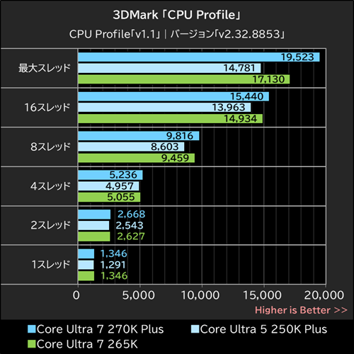 CPU性能をスレッド数ごとに計測する3DMarkのCPUテスト「CPU Profile」では、Core Ultra 7 270K Plusがすべての条件でCore Ultra 7 265Kと同等以上のスコアを記録。すべてのCPUコアで処理を行う最大スレッドではCore Ultra 7 265Kを約14%上回った。