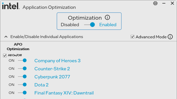 利用するにはAPO(Application Optimization)ツールで有効化する必要があり、自動的に動作するものではないようだ。また、Core Ultra 7 265Kではツール上に機能自体が表示されなかった。