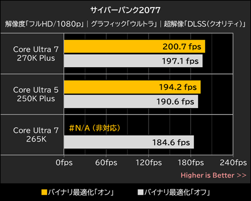 バイナリ最適化有効時のCore Ultra 7 270K Plusは200.7fps、Core Ultra 5 250K Plusは194.2fpsを記録しており、バイナリ最適化無効時より2%弱ほど平均フレームレートが向上した。