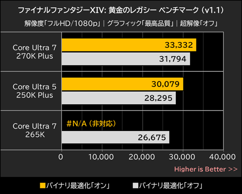 バイナリ最適化有効時のスコアを確認してみると、Core Ultra 7 270K Plusは33,332を記録して無効時を約5%上回り、Core Ultra 5 250K Plusも30,079を記録して無効時を約6%上回った。サイバーパンク2077に比べるとバイナリ最適化の効果が大きい様子が見て取れる。