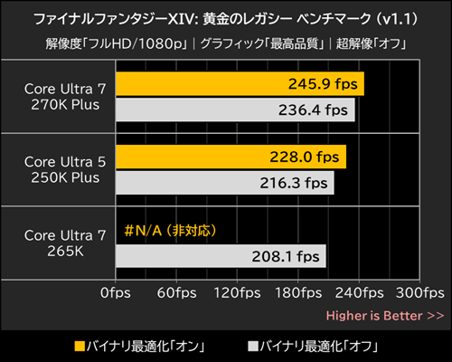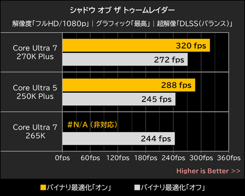 バイナリ最適化有効時の平均フレームレートを確認してみると、Core Ultra 7 270K Plusが320fps、Core Ultra 5 250K Plusは288fpsを記録しており、いずれもバイナリ最適化無効時を約18%も上回っている。