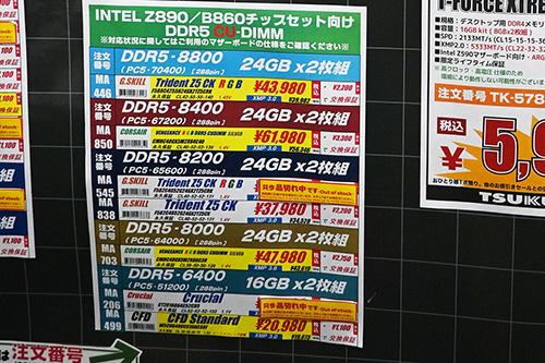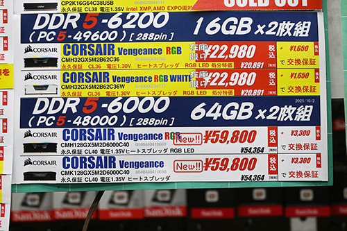 新製品では、DDR5-6000 64GB×2枚組が販売開始。秋葉原の店頭で購入可能な64GB×2枚組の速度は、DDR5-6400/6000/5600の3通りとなった。今回出回り始めたDDR5-6000対応品の価格は59,800円(Corsair)。DDR5-6400対応品(64,900円/Corsair)より5,100円安く、DDR5-5600対応品(44,980円/Crucial)より14,820円高い。