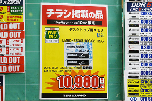 DDR5メモリは上昇が顕著。9月下旬から10月上旬にかけて特価の終了が目立ち、10月4日の秋葉原巡回ではメモリの特価ポップが大きく減っていた。DDR5-5600~6400にかけての速度帯では、多くが最安値が10~20%以上の上昇を記録している。