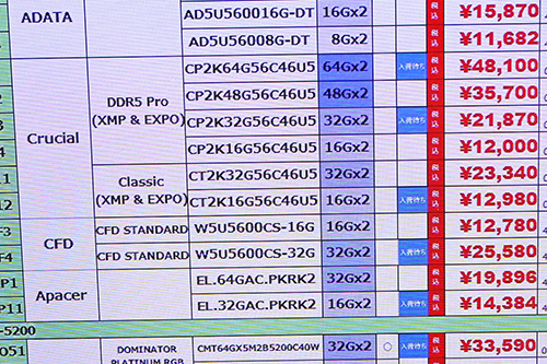それらを列挙すると、DDR5-6400 64GB×2枚組が7,100円(12.3%)高の64,900円(Corsair)、16GB×2枚組が1,180円(10.0%)高の12,980円(V-COLOR)、DDR5-6000 32GB×2枚組が4,500円(21.4%)高の25,480円(Team)、16GB×2枚組が2,255円(21.5%)高の12,735円(Crucial)、DDR5-5600 16GB×2枚組が1,000円(10.0%)高の10,980円(Links)などだ。