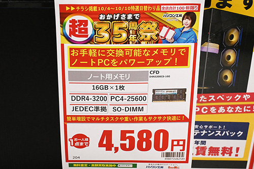 DDR4 SO-DIMMは、「DDR4-3200」16GB×2枚組が1,820円高の11,800円(Apacer)に上昇。平均価格も1,073円(8.4%)上がった。なお、16GB(1枚)は600円安の4,580円(CFD販売)で特売されており、計算上は2枚で9,160円だ。