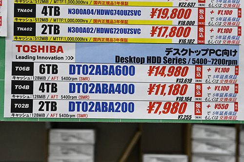 東芝「DT02」は、DT02ABA600(6TB)が14,980円(1GB単価2.50円)、DT02ABA400(4TB)が11,180円(2.80円)、DT02ABA200(2TB)が300円高の7,980円で、4TBと2TBは今回調査の最安。ただし平穏というわけではなく、4TBは平均1,533円(13.7%)、2TBは724円(8.8%)上昇した。