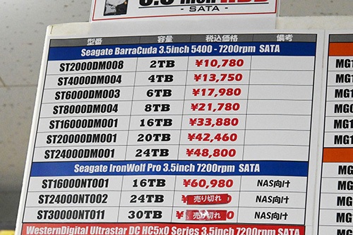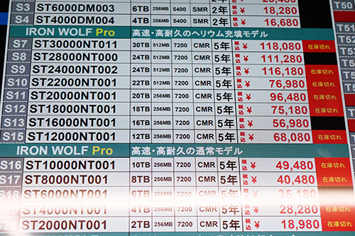 4~8TBモデルも上昇。最安値の動きはST8000DM004(8TB)が800円高の17,780円(1GB単価2.22円)、ST6000DM003(6TB)は700円高の14,780円(2.46円)、ST4000DM004(4TB)は300円高の11,780円(2.95円)と比較的穏やか(?)だが、平均では2,269円(12.4%)、2,032円(13.5%)、1,207円(10.1%)も上がっている。中心価格は8TBが20,000円前後、6TBが16,000円台、4TBは12,000~13,000円台だ。