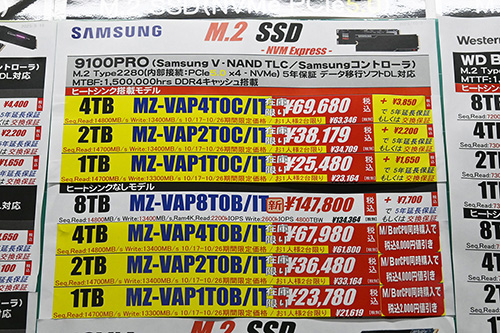 値動きの面では、Samsung「9100 PRO」が大幅特価。今回はヒートシンク搭載版が12.1~13.2%も下がっており、4TBが10,290円安の69,680円、2TBが5,801円安の38,179円、1TBが3,500円安の25,480円となった。既に特売中の非搭載版も、4TBが2,000円安の67,980円、2GBが500円安の36,480円に下がっている。ヒートシンクの有無による差は1,700円前後だ。