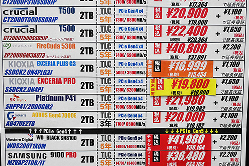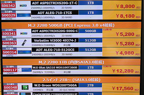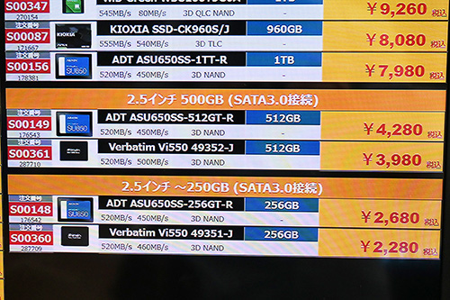 値動きではCrucial「BX500」が上昇しており、4TBが2,820円高の37,800円、2TBが980円高の17,480円など。2.5インチで容量最大のSamsung「870 QVO」8TB(前回113,979円)は品切れになっている。