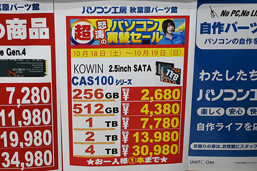 2.5インチ・SATAタイプの最安値は、4TBがKowin「CAS100」で1,000円安の30,980円(1GB単価7.6円)、2TBも「CAS100」で400円安の13,980円(6.8円)、1TBはTeam「CX2」で6,800円(6.6円)、500GBクラスはVerbatim「Vi550」512GBなどで3,980円(7.8円)、250GBクラスも「Vi550」256GBで2,280円(8.9円)。