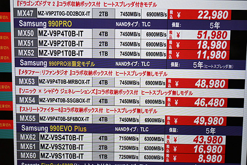 PCIe 4.0対応・6,000~7,000MB/s級もSamsung製SSDの一部が特価。「990 PRO」ヒートシンク搭載2TBが2,000円安の19,980円(1GB単価10.0円)、非搭載2TBが5,990円安の18,980円(9.5円)、1TBが3,500円安の11,980円(12.0円)だ。一部ショップで特売されているゲームコラボ版は、ヒートシンク非搭載4TBが5,500円安の46,480円(11.6円)で出ており、中心価格(51,980円)より5,500円安い。