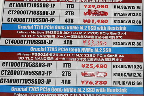 一方で上昇の動きもあり、Western Digital(Sandisk)「WD Black SN850X」はヒートシンク搭載4TBが5,500円高の47,980円、非搭載4TBが2,320円高の44,800円に上昇。1~2TBモデルもやや値上がりしている。Crucialは「P310」ヒートシンク搭載4TBが1,000円高の40,980円となったほか、前回36,280円だった非搭載4TBが品切れになり、1~2TBも1,000円前後上昇した。