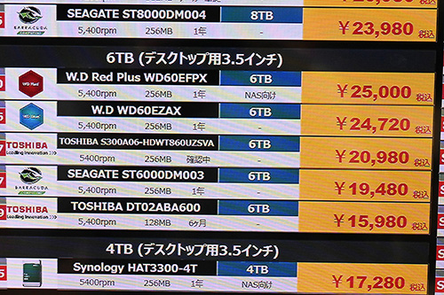 4~8TBは、ST8000DM004(8TB)が1,145円高の18,925円、ST6000DM003(6TB)は2,100円高の16,880円、ST4000DM004(4TB)が900円高の12,680円。ST8000DM004は、2万円以下で購入可能な今回唯一の8TBモデルとなっている。念のために付言すると、いずれも特売としての価格であり、中心は8TBが21,000円前後、6TBが19,000円台、4TBが13,000円台だ。