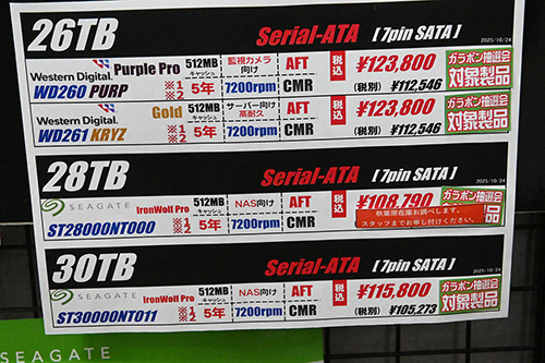 NAS・ビジネス向けは、Western Digital「WD Red Plus」4~8TBがやや上昇。WD80EFPX(8TB)は1,000円高の29,900円、WD60EFPX(6TB)は970円高の23,950円、WD40EFPX(4TB)は1,300円高の18,900円だ。10~12TBは小幅な動きに留まっている。このほか「WD Gold」「WD Purple Pro」「WD Red Pro」の26TBモデルがそれぞれ値上がりし、123,800円となった。