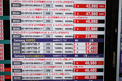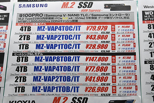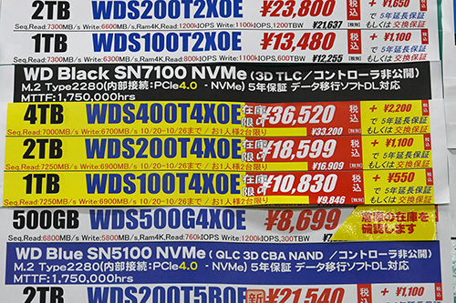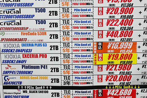 なお、Samsung「9100 PRO」ヒートシンク搭載2TBは一部で38,180円の特価が残っているが、多くのショップでは43,980円に上昇。Crucial「T710」、Western Digital(Sandisk)「WD Black SN8100」など、ほかのモデルは小幅な値動きだ。