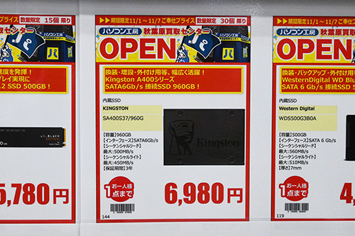 個別の値動きでは、M.2/NVMeほどではないが、複数モデルが特売中。Western Digital(Sandisk)「WD Blue SA510」1TBが1,670円安の7,980円、500GBが1,820円安の4,480円、Crucial「BX500」1TBが380円安の7,980円、240GBが620円安の3,180円などだ。