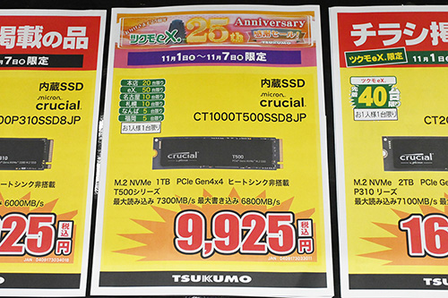 8TBの特売は11月1日(土)時点で終了済み。ヒートシンク搭載版は前回比3,000円安の100,800円となったが、非搭載版は100,490円に戻った。また、11月1日にはヒートシンク非搭載1TBが一部で特売され、3,000円安の9,480円と1万円を切っている。