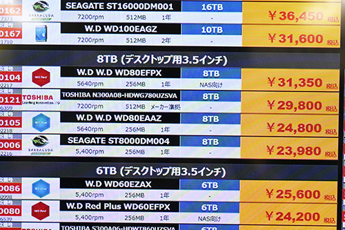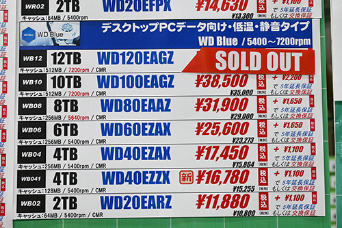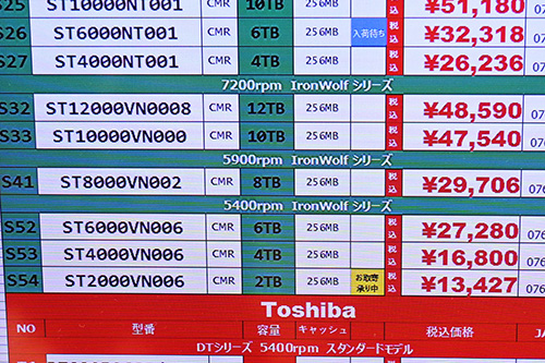 このほか、東芝「DT02」も上昇。DT02ABA600(6TB)が1,620円高の17,600円、DT02ABA400(4TB)が1,800円高の12,980円となったが、6TB、4TBクラスではそれぞれ今回調査で最も安い。