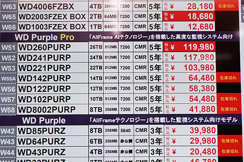 価格面では、WD120EFGX(12TB)が2,000円高の45,980円、WD100EFGX(10TB)も2,000円高の40,800円に上昇。WD80EFPX(8TB)は1,450円高の31,350円に上がった。このほかのWestern Digital製ビジネス向けHDDも上昇が目立つが、「WD Purple Pro」WD260PURP(26TB)は3,820円安の119,980円に下がり、今回調査の26TBクラスで最安となっている。