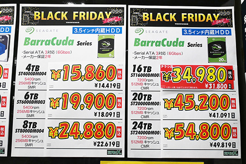 Seagate「BarraCuda」はほかにも、ST6000DM003(6TB)が2,920円(17.3%)高の19,800円(1GB単価3.30円)、ST4000DM004(4TB)が2,300円(18.1%)高の14,980円(3.75円)と、かつては求めやすかった4~8TBモデルが軒並み大幅上昇。大容量品はST16000DM001(16TB)が34,980円(2.19円)で特売中だが、ST24000DM001(24TB)は6,000円高の54,800円(2.28円)に上がっている。
