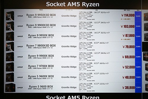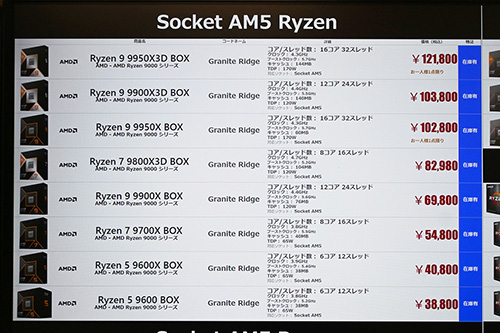 一部モデルが値下がりしているが、Ryzen全体としては上昇傾向。Socket AM5対応モデルで値下がりしたものから紹介するが、「Ryzen 9 9950X3D」が4,800円安の114,800円、「Ryzen 7 8700G」が1,000円安の47,800円、「Ryzen 7 7800X3D」が3,000円安の54,800円などとなっている。値上がりでは、「Ryzen 7 9800X3D」は7,200円高の79,800円、「Ryzen 5 9600X」は3,000円高の40,800円、「Ryzen 5 8600G」は2,490円高の35,080円などが目立つ。
