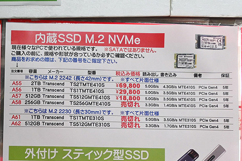 目立つのは、M.2 2242サイズ・Transcend「MTE410S」の急騰で、2TBが35,000円(100.6%)高の69,800円、1TBが11,000円(58.5%)高の29,800円、512GBが7,000円(59.3%)高の18,800円。M.2 2230サイズのWestern Digital(SanDisk)「WD Black SN770M」は、2TBが25,600円で横ばい、1TBが580円高の14,080円など比較的静かだ。