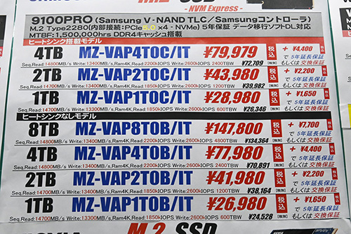 Samsung「9100 PRO」は大幅特売が終了。ヒートシンク搭載4TBが10,299円高の79,979円、2TBが5,801円高の43,980円、1TBが3,500円高の28,980円、非搭載4TBが10,000円高の77,980円、2TBが5,500円高の41,980円、1TBが3,200円高の26,980円だ。