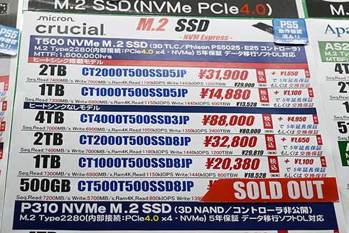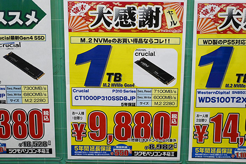 Crucialの廉価モデル「P310」はヒートシンク搭載4TBが7,300円高の60,880円、非搭載4TBが13,020円(29.7%)高の56,800円、2TBが7,020円(34.3%)高の27,500円、1TBが5,100円(51.6%)高の14,980円。前回紹介した「P310」ヒートシンク非搭載1TBの特価品(9,880円)は今回も見られたのだが、秋葉原を一巡りして戻ったら売り切れていた。