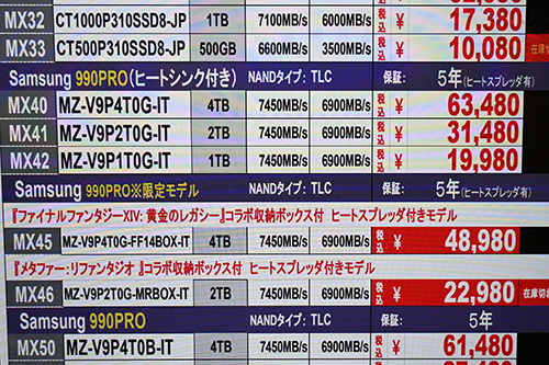 なお、Samsung「990 PRO」ヒートシンク搭載2TBは8,499円高の31,479円。何度かお伝えしたように、一部ショップで特売されているゲームコラボ版が売り切れ、通常版のみとなったことによるものだ。