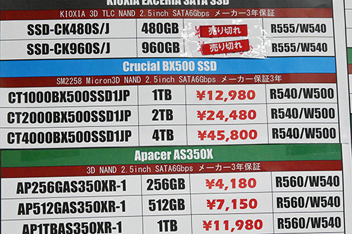 値動きは強い上昇傾向が続いており、Crucial「BX500」4TBが4,000円高の45,800円、2TBが5,780円(30.9%)高の24,480円、SanDisk「SSD Plus」2TBが6,050円高の23,870円、1TBが3,300円高の12,870円など。特価販売されることが多いKingston「A400」も、960GBが4,000円高の12,980円、480GBが1,200円高の7,480円となった。