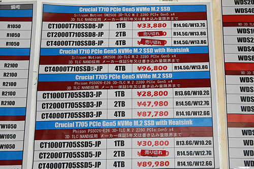 Crucialは「T710」ヒートシンク搭載4TBが11,000円高の96,800円、「T705」ヒートシンク搭載4TBが21,000(30.4%)高の89,980円、2TBが9,300円高の52,580円、非搭載4TBが5,980円高の87,780円、2TBが6,600円高の47,980円と大幅上昇。「T705」ヒートシンク搭載1TBは在庫ショップ数の増加で2,410円安の27,390円に下がっている。