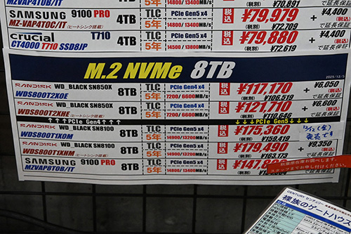 SSDはCrucialを中心に大幅な値上がりが継続、新モデルは「WD Black SN8100」のヒートシンク搭載版が発売[12月前半のSSD価格]]