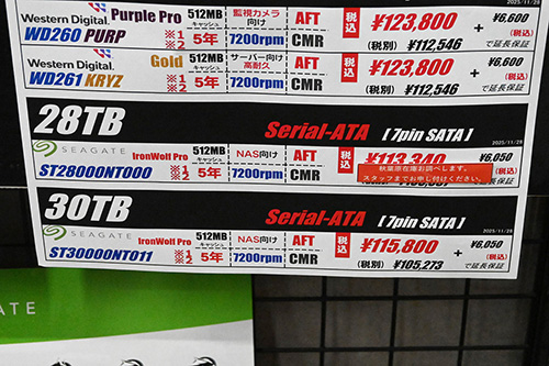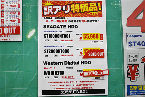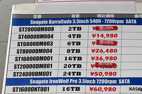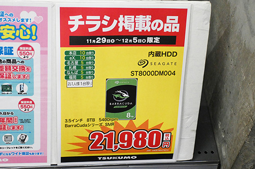なお、ST18000NT001(18TB)は21,020円高の77,000円だが、前回調査時の55,980円は「メーカー保証期間が通常より短い」との注記がある訳あり特価。12月6日時点で品切れのため、通常価格のみとなっている。