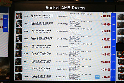 値動きの面では、Ryzen 9000の一部が値下がり。「Ryzen 9 9900X」が2,000円安の67,800円、「Ryzen 7 9800X3D」が6,568円安の73,232円、「Ryzen 5 9600X」が3,873円安の36,927円などだ。「Ryzen 9 9950X」は最安値が87,800円で変わっていないが、平均価格が5,000円下がり、前回10万円を超えていたショップも含め87,800円に揃っている。