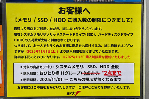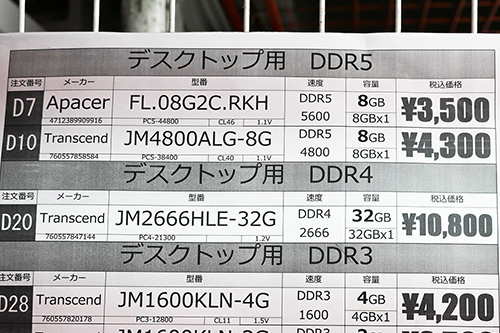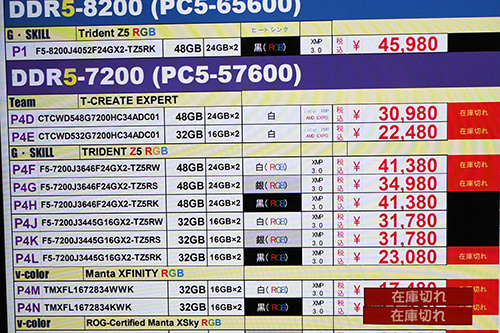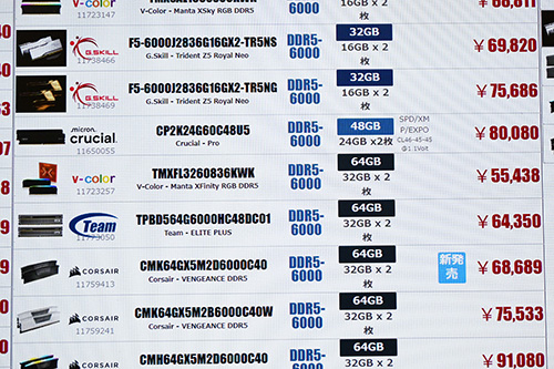 中心価格帯は、「DDR5-6000」が6万円台後半(Crucialは11万円前後)、「DDR5-5600」が7~7万円台(同9万円前後)。以前からお伝えしているように、ばらつきが大変大きい。もちろんメモリ全体が品薄でもあり、購入制限を知らせる掲示が複数のショップに出ている。