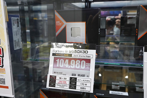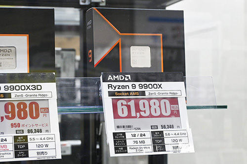 値動きの面では、Ryzen 9000シリーズの一部が下落。12月13日(土)に「Ryzen 9 9950X3D」が9,820円安の104,980円を付けた。20日時点では、「Ryzen 9 9950X3D」が前回比4,820円安の109,980円、「Ryzen 9 9950X」が4,820円安の82,980円、「Ryzen 9 9900X」が5,820円安の61,980円、「Ryzen 7 9700X」が2,865円安の46,980円となっている。