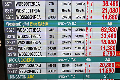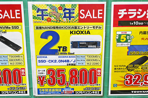 年末から年始にかけて特価が散見。ただし、Western Digital(Sandisk)を中心に値上がりの動きが一層強まっており、在庫ショップ数の減少や品切れも目に付く。