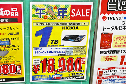 個別の値動きでは、12月27日にADATA「SU650」960GBが2,981円安の9,999円(1GB単価10.4円)で特売。ちなみに、その2週間前(13日)にはKingston「A400」960GBが6,980円、さらに2週間前(11月29日)にはHIKVISION製1TBが5,980円を付けていた。それが今では、1TBクラスが1万円を切っていると、二度見せずにはいられない。