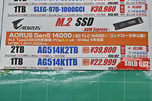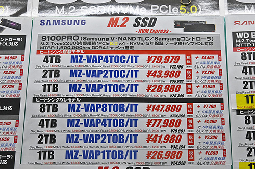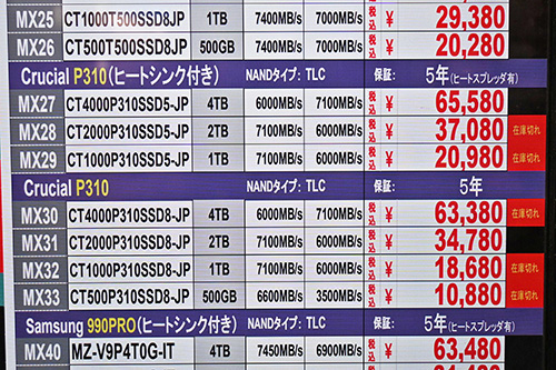 なお、Samsung「990 PRO」は価格が横ばいながら、ヒートシンク非搭載版の在庫ショップ数が急減。多くのショップで見られた「990 EVO Plus」も4TBと1TBが一気に品切れとなり、わずかに在庫のある2TBは7,000円高の33,980円に上がった。
