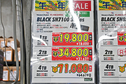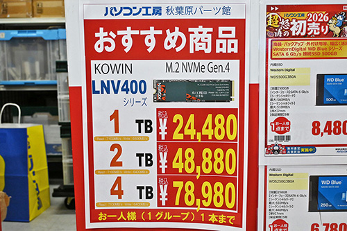なお、1月3日調査時には、Sandiskブランドの「WD Blue SN5100」が一部ショップで特売。1TBが14,480円、500GBが8,480円だった。しかし今回調査の10日時点では、4TBが前回比14,550円(29.7%)高の63,580円、2TBが3,220円高の29,200円、1TBが3,000円高の20,980円、500GBが5,020円(59.2%)高の13,500円となっている。