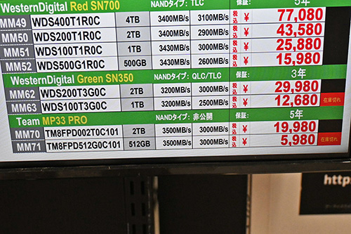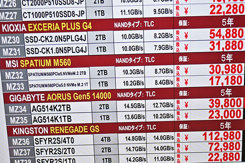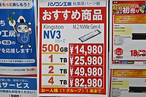 Kingston「NV3」もまた、4TBが26,700円(54.5%)高の75,680円、2TBが18,840円(89.8%)高の39,820円など約50~90%の上昇。12月27日には4TBが前回比3,000円安の45,980円、2TBが1,000円安の19,980円で特売されていたが、振れ幅の大きさに戦慄するばかりだ。