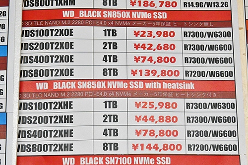 PCIe 4.0対応・6,000~7,000MB/s級はWestern Digital(Sandisk)が高騰。「WD Black SN850X」はヒートシンク搭載8TBが23,820円高の144,800円、4TBが22,820円高の78,800円など、非搭載2TBが10,600円高の42,680円、1TBが7,180円高の23,980円など、前回比19~44%台の大幅な値上がりだ。