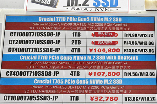 前回一部が値下がりしたCrucialも今回調査では上昇。「T710」ヒートシンク非搭載4TBが14,600円高の94,480円、2TBが1,880円高の57,680円、1TBが2,600円高の35,980円だ。品切れしていたヒートシンク搭載4TBは再入荷したが、以前在庫のあった12月6日(96,800円)と比べて、11,000円高の107,800円に上がっている。