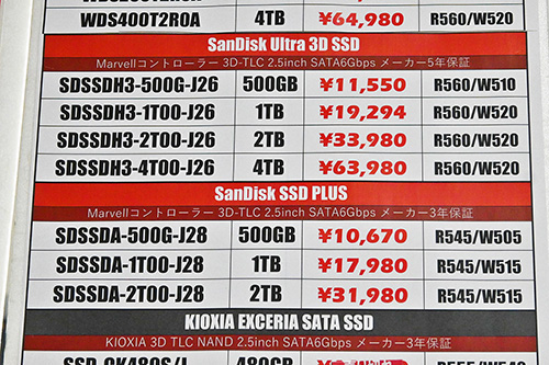 Sandiskも全面的に上昇。「Ultra3D」4TBが17,120円(36.5%)高の63,980円、2TBが9,120円(36.7%)高の33,980円、「SSD Plus」2TBが6,930円(29.0%)高の30,800円、1TBが4,510円(35.0%)高の17,380円などで、値上がり率は最大47.9%にもなる。