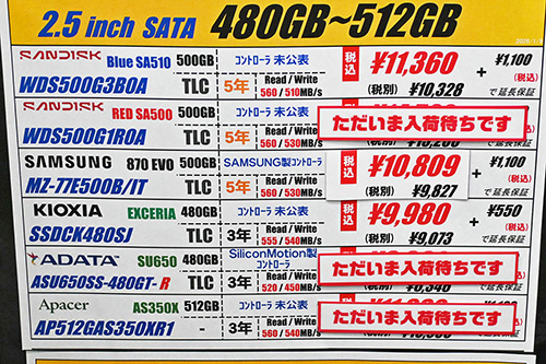 2.5インチSATA SSDは全面的な大幅続騰