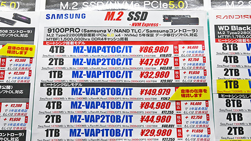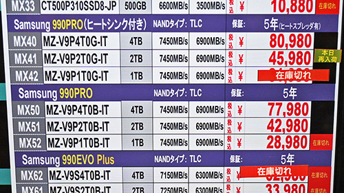 ただし、一部ショップではヒートシンク非搭載8TBが416,710円、1TBが52,140円と、信じがたいほど急騰。後述する「WD Black SN850X」「SN7100」「WD Blue SN5100」も同様の動きを見せており、秋葉原全体の傾向ではないが、極めて不穏だ。