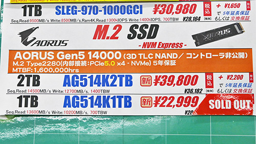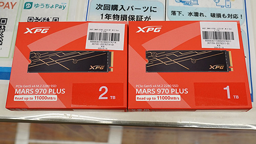 新製品としては、ADATA「MARS 970 PLUS」(1~2TB)が販売開始。最大データ転送速度はリード10,500~11,000MB/s、ライト9,500~10,000MB/sで、総書き込み容量は600~1,200TBWとなっている。価格は2TBが55,480円(1GB単価27.7円)、1TBが29,800円(29.8円)だ。