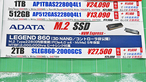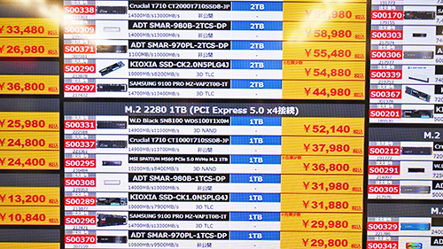 個別の値動きでは、Western Digital(Sandisk)「WD Blue SN5000」4TBが6,900円高の61,880円、2TBが3,380円高の33,180円、「WD Green SN3000」2TBが4,180円高の31,980円に上昇。ほかに、ADATA「LEGEND 710」1TBが12,810円高の24,800円、512GBが5,820円高の12,800円、Apacer「AS2280P4X」512GBが3,800円高の12,800円などとなっている。